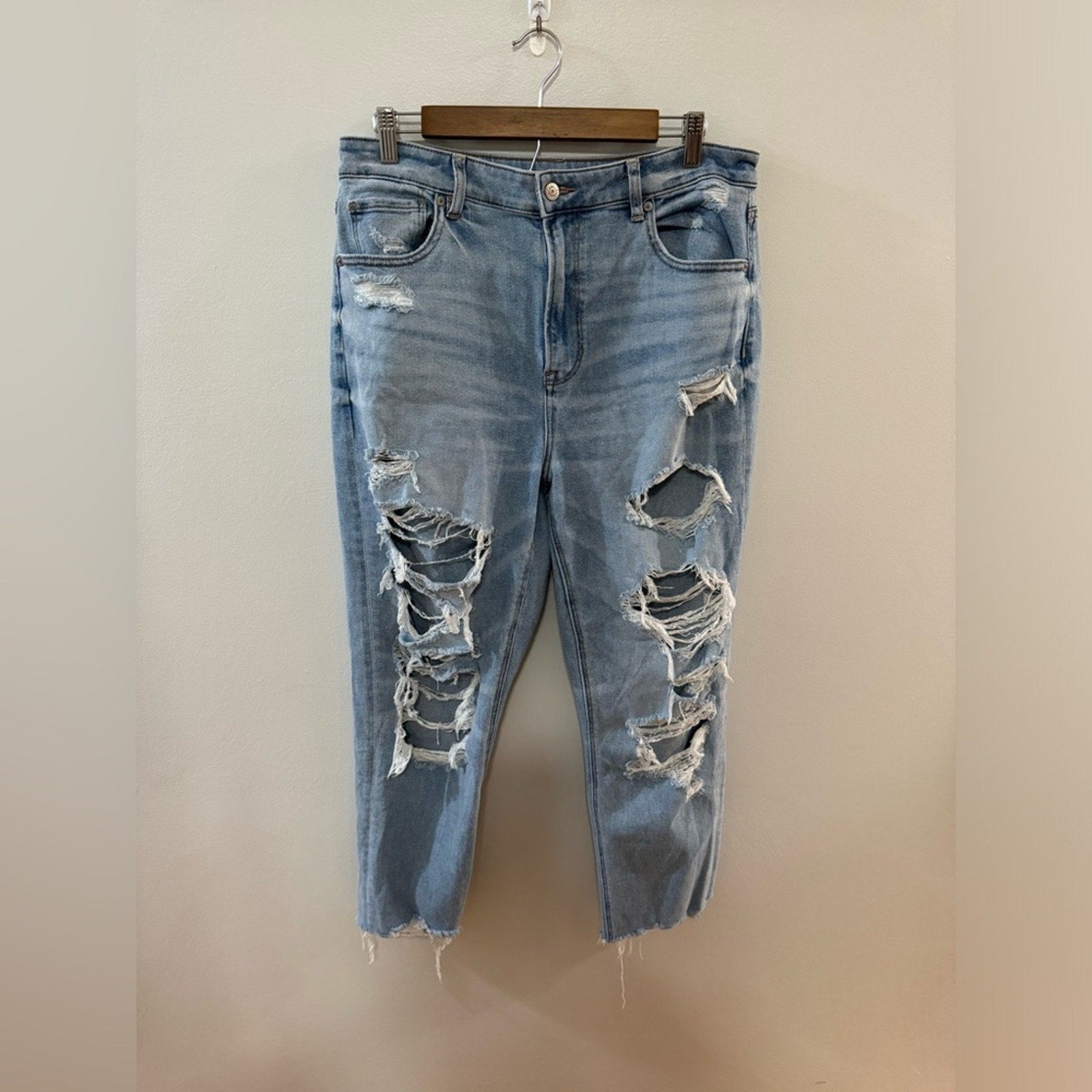 Pre-Owned Size 14 American Eagle Light Blue Heavily Distressed Mom Jeans