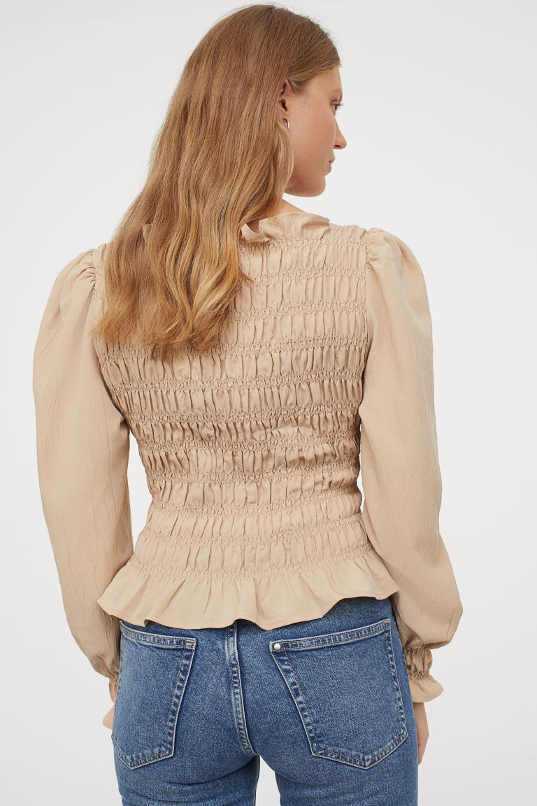 Puff-sleeved Smocked Blouse - Beige - Ladies | H&M US 2