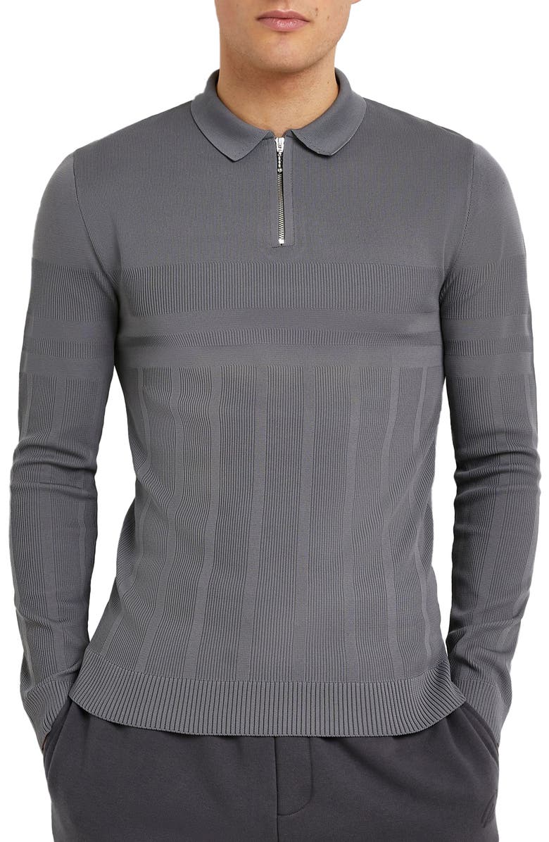 RIVER ISLAND Mix Rib Long Sleeve Polo, Main, color, DARK GREY