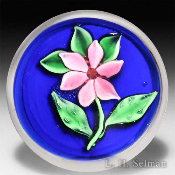 Ronald Hansen pink clematis on cobalt blue ground petite paperweight. by Ronald Hansen