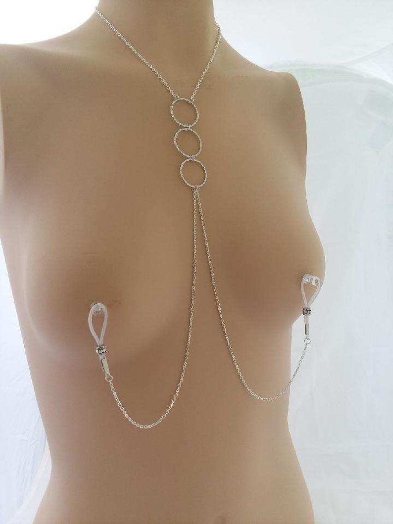 Silver tri-circle necklace attached to nipple nooses or feel the sting with one of our five types of nipple clamps. BDSM, non-piercing