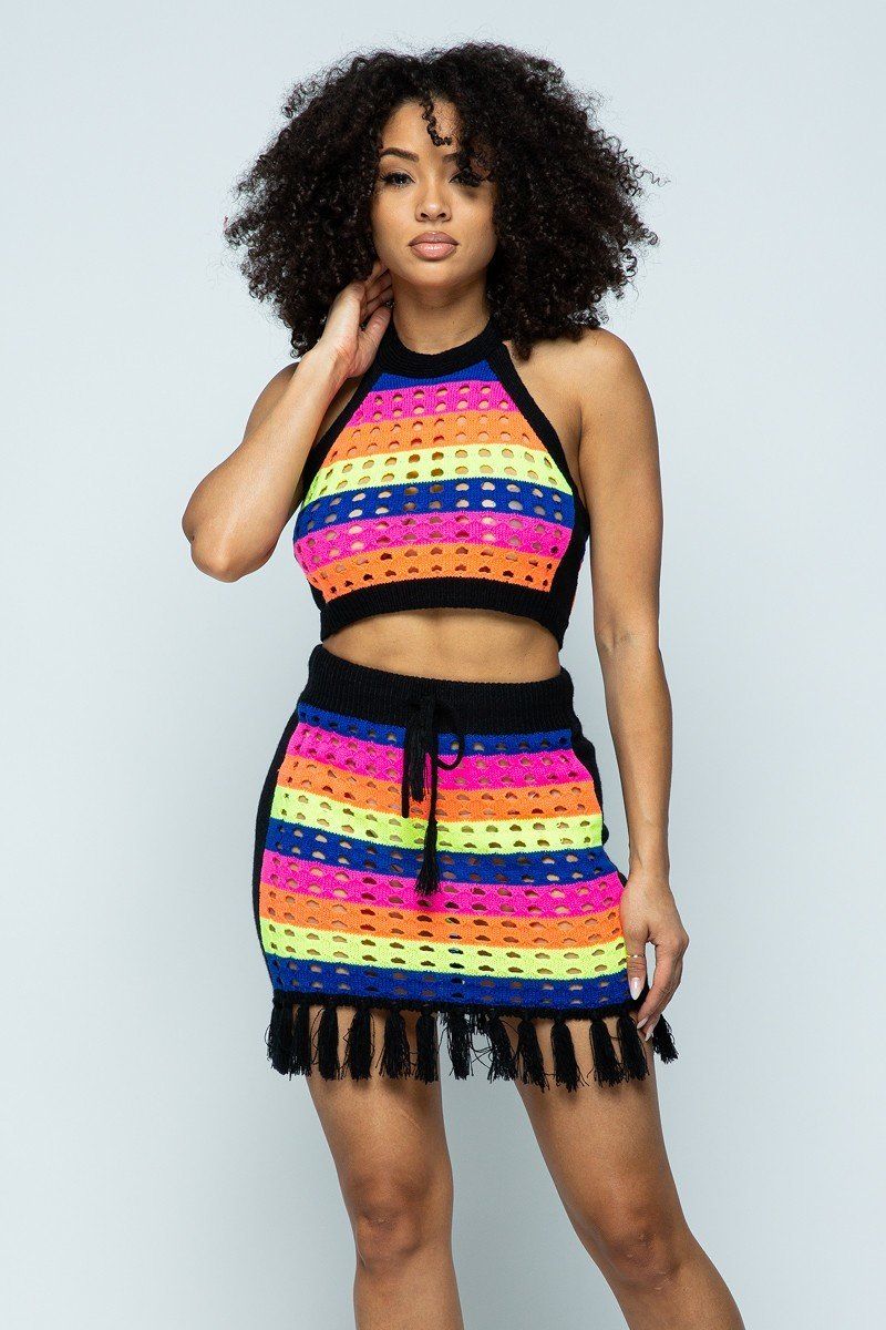 Striped Multi Color Laser Cut Cropped Halter Top/short Skirt Knit 2 Piece Set With Tassels