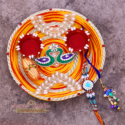 Superb Pearl n Mouli Work Rakhi Pooja Thali With Bhaiya Bhabhi Rakhi