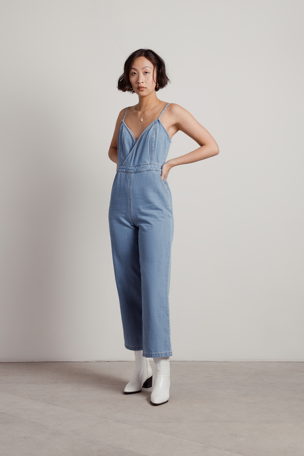 Surplice Wide Leg Denim Overall Jumpsuit in Medium Wash
