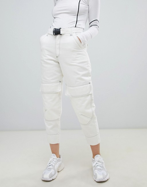 tapered jeans in winter white with utility styling and contrast stitch