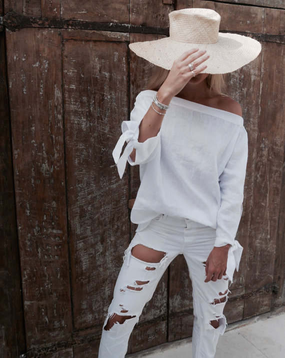 The Ari Top - White Linen Off Shoulder Top with Split, Tie-up Sleeves, Black Linen