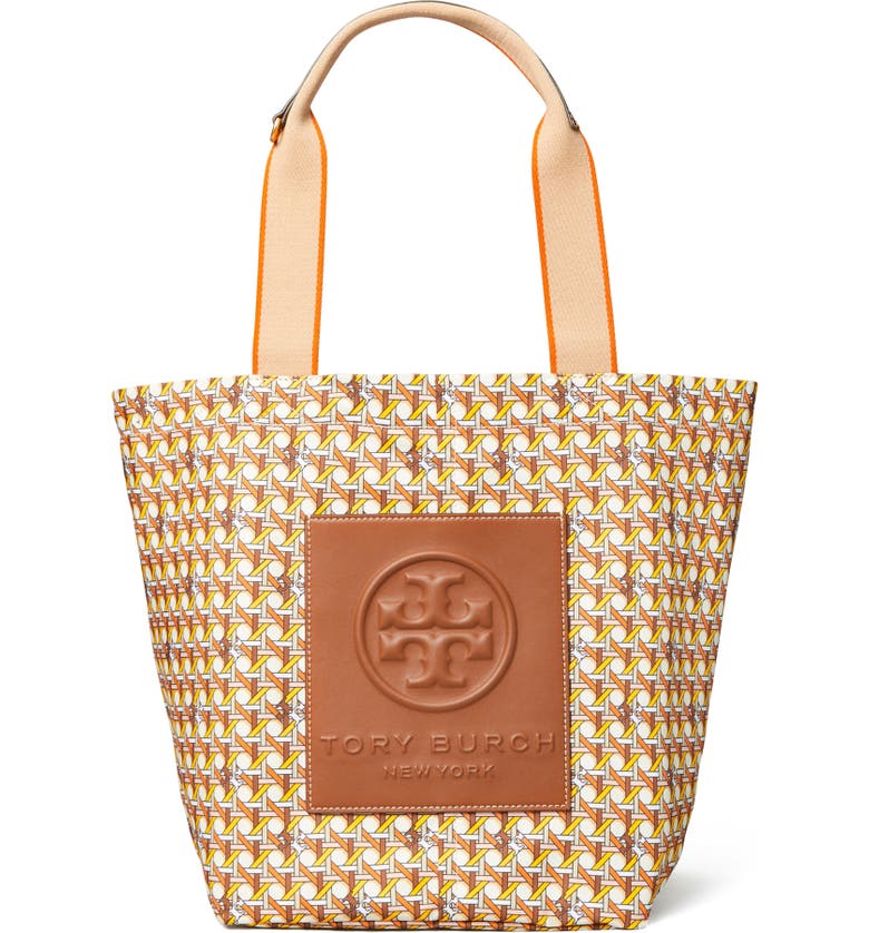 TORY BURCH Small Basketweave Nylon Tote, Main, color, ORANGE CANING LOGO GEO