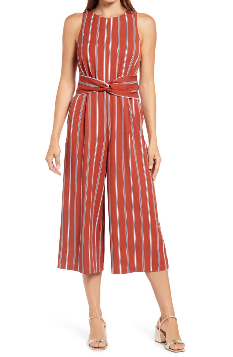 Twist Front Sleeveless Jumpsuit, Main, color, ORANGE STRIPE