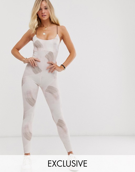 unitard with back strap detail in brush stroke print