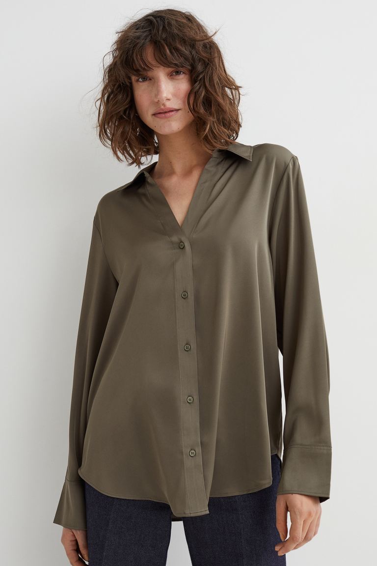V-neck Blouse - Dark khaki green - Ladies