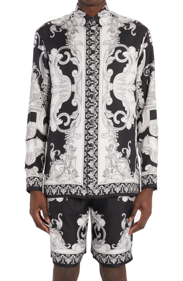 VERSACE Baroque Print Silk Button-Up Shirt, Main, color, BLACK/ WHITE