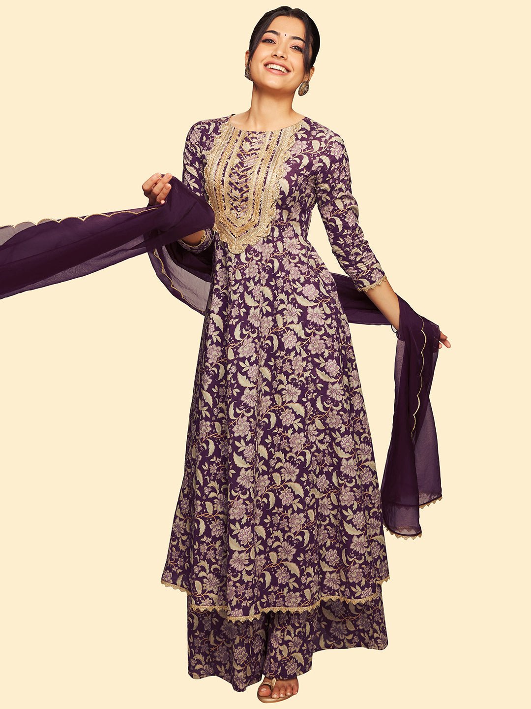 Voilet Cotton Floral Printed Kurta with Palazzo and Dupatta