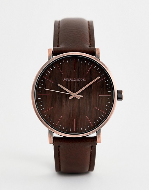 watch with wood effect and brushed copper finish
