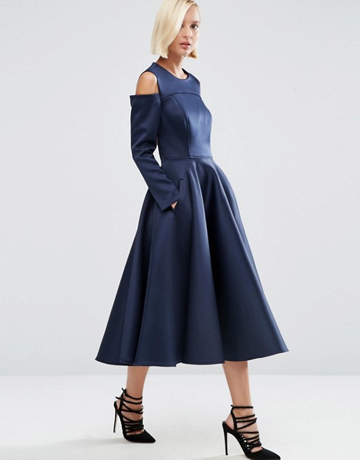 WHITE Bonded Satin Midi Dress With Cold Shoulder