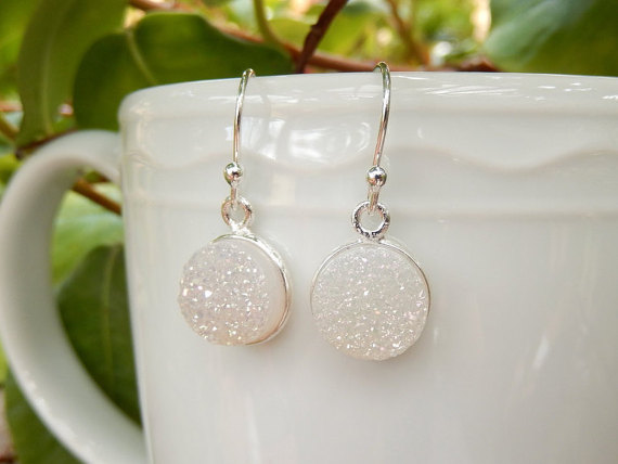 White Druzy Earrings Sterling Silver Drusy Snow Quartz Round Circle Titanium Dainty Drops